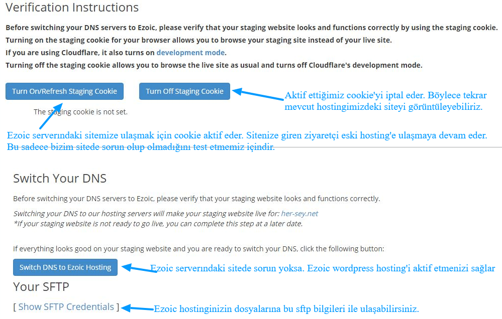 Turn On/Refresh Staging Cookie: Ezoic serverındaki sitemize ulaşmak için cookie aktif eder. Sitenize giren ziyaretçi eski hosting’e ulaşmaya devam eder. Bu sadece bizim sitede sorun olup olmadığını test etmemiz içindir.